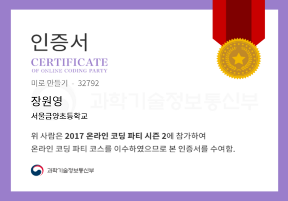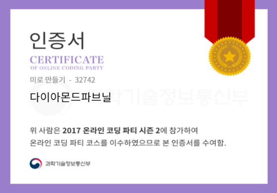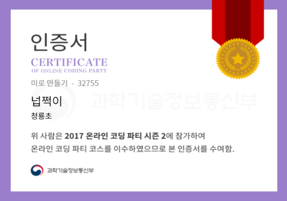 온라인 코딩 파티 참여하고 미션에 성공해 인증서를 받아보세요. 미션을 완료하면서 받은 인증서를 ‘인증서 자랑하기’에 등록해 주세요.
