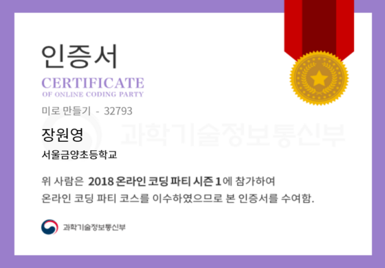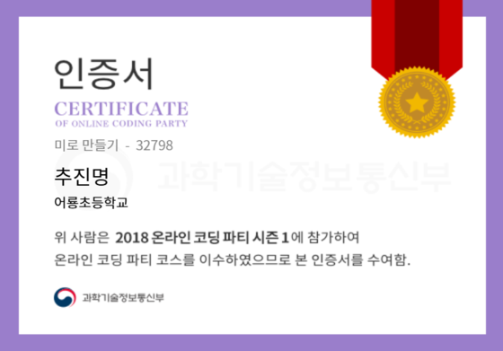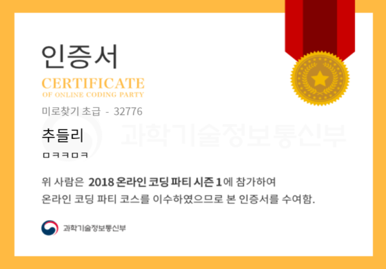 온라인 코딩 파티 참여하고 미션에 성공해 인증서를 받아보세요. 미션을 완료하면서 받은 인증서를 ‘인증서 자랑하기’에 등록해 주세요.